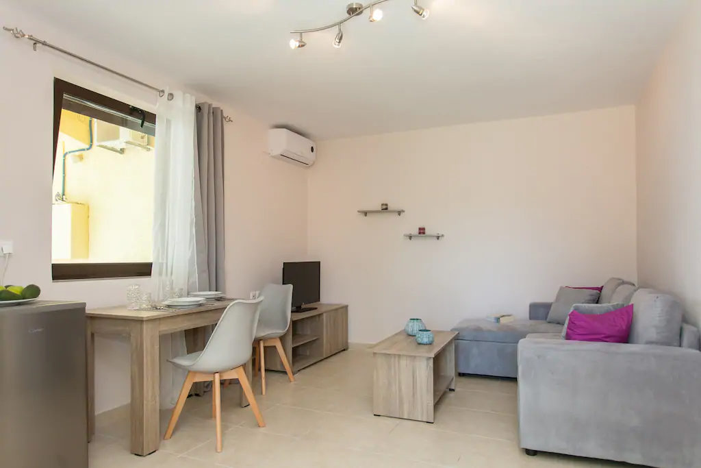 It is located in a small residential complex with a wonderful garden, just a few steps from the sea (250m from the sandy beach “Pahia Ammos”).